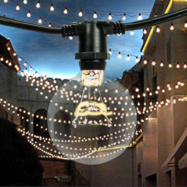 Each bulb socket includes a candelabra base compatible with incandescent or LED bulbs and is spaced 18 inches apart with a total of 15 sockets per string. Connect up to 4 stringers for a maximum run of 960 watts. Complete this PLT Solutions stringer with vintage bulbs to a add whimsical touch to outdoor parties, weddings, and barbeques.